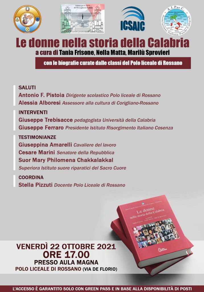 Giorno 22 ottobre presso l’Aula Magna del Polo Liceale di Rossano verrà presentato il volume “Le donne nella storia della Calabria”, edito dalla Jonia Editrice e curato da Tania Frisone, presidente AIParC Cosenza, Nella Matta, responsabile Commissione Cultura AIParC Cosenza, Marilù Sprovieri, componente Commissione Cultura-Area Ricerche e Studi – AIParc Cosenza. Interverranno il prof. Giuseppe Trebisacce, consigliere AIParC Cosenza ed il prof. Giuseppe Ferraro, che ha guidato gli alunni e le alunne che hanno redatto varie biografie. Saranno presenti anche il prof. Antonio Franco Pistoia, dirigente del Polo Liceale, e Alessia Alboresi, assessore alla cultura. Preziose saranno le testimonianze di Giuseppina Amarelli, Cesare Marini e Suor Mary Philomena Chakkalakkal.Modererà il tutto la prof.ssa Stella Pizzuti, docente del Polo Liceale.