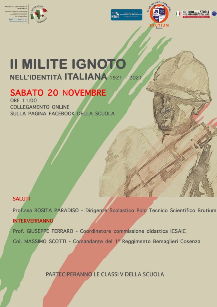 Sabato 20 novembre presso il Polo Tecnico Scientifico Brutium si terrà un altro evento che rientra tra le celebrazioni per il Centenario della traslazione della salma del Milite Ignoto. Tra i vari relatori ci saranno il dirigente Prof.ssa Rosita Paradiso, il Prof. Ferraro ed il Colonnello Massimo Scotti. Parteciperanno le classi quinte del Polo.