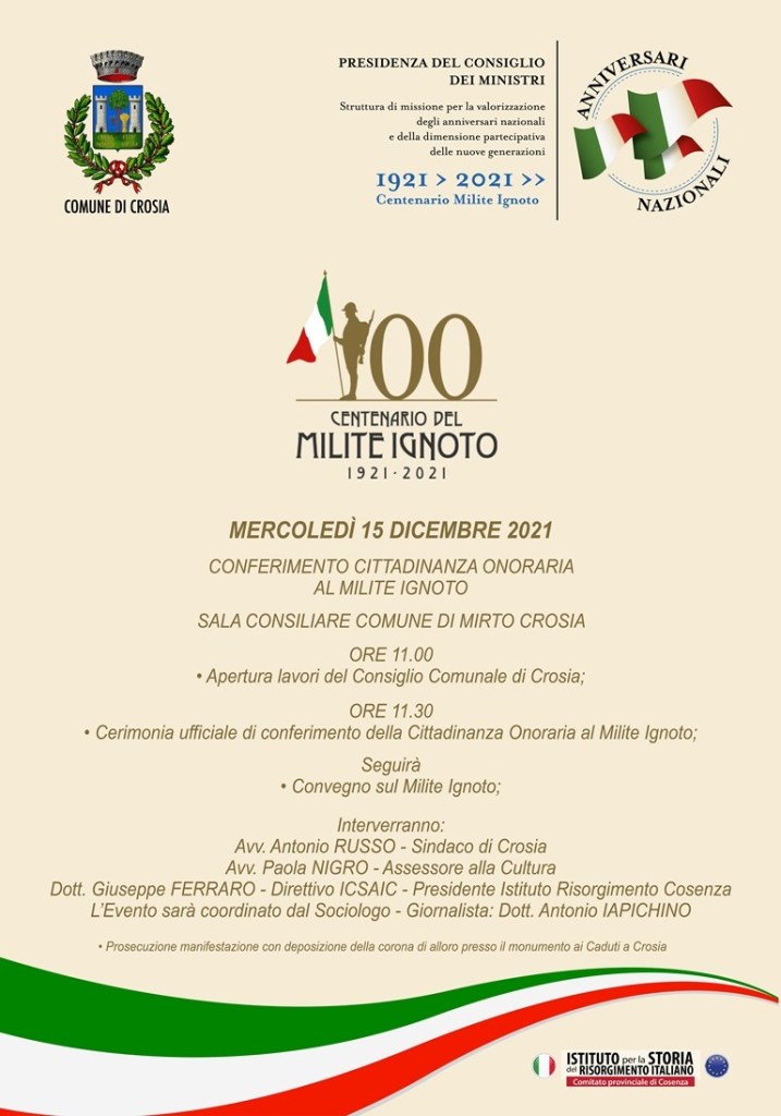 Mercoledì 15 dicembre presso il Comune di Crosia verrà conferita la Cittadinanza Onoraria al Milite Ignoto . Dopo la solenne cerimonia si terrà un convegno al quale prenderanno parte il sindaco Antonio Russo, l’assessore alla cultura Paolo Nigro ed il nostro direttore Giuseppe Ferraro. L’evento sarà moderato dal giornalista Antonio Iapichino.