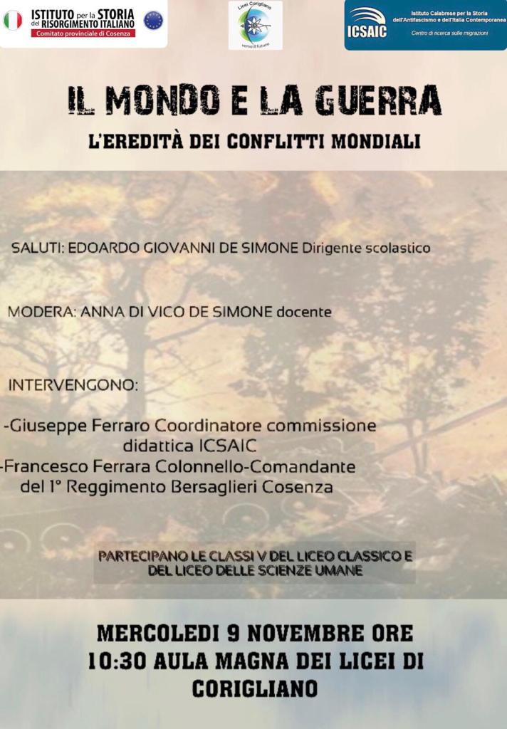 Giorno 9 Novembre alle ore 10.30, presso l’Aula Magna dei Licei di Corigliano, si parlerà della Grande Guerra. Tra i relatori il prof. Giuseppe Ferraro ed il Colonnello Francesco Ferrara. Modera la prof.ssa Anna Di Vico De Simone. Sarà presente il Dirigente Edoardo Giovanni De Simone.