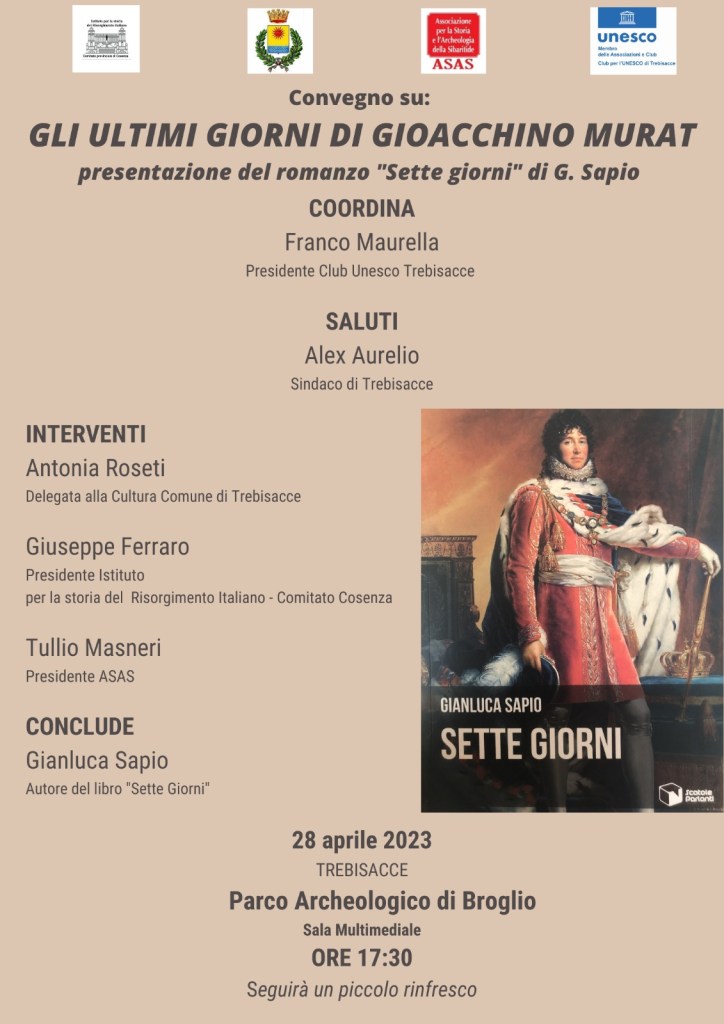 Giorno 28 aprile alle ore 17:30, presso la Sala multimediale del Parco Archeologico di Broglio, si terrà un interessante convegno, “Gli ultimi giorni di Gioacchino Murat”, durante il quale verrà presentato il romanzo “Sette giorni” di G. Sapio. Tra i vari interventi ci sarà anche quello del nostro direttore, il professor Giuseppe Ferraro.