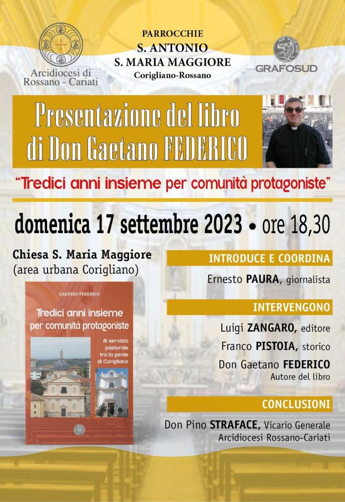 Giorno 17 Settembre, alle ore 18.30, presso la Chiesa di Santa Maria Maggiore in Corigliano, verrà presentato il volume di Don Gaetano Federico, “Tredici anni insieme per comunità protagoniste”