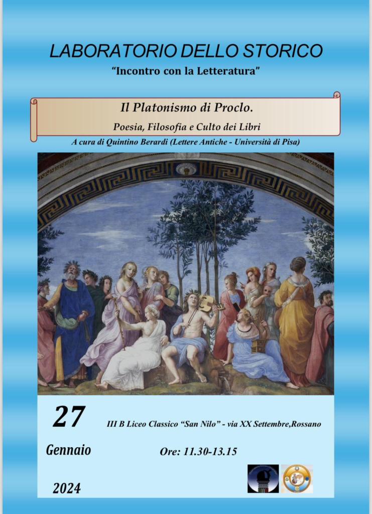In occasione del progetto LABORATORIO DELLO STORICO giorno 27 Gennaio si terrà il seminario “Incontro con la Letteratura – Il Platonismo di Proclo. Poesia, Filosofia e Culto dei Libri” a cura di Quintino Berardi (Università di Pisa), coordinatore dell’Osservatorio Giovani Universitari.
