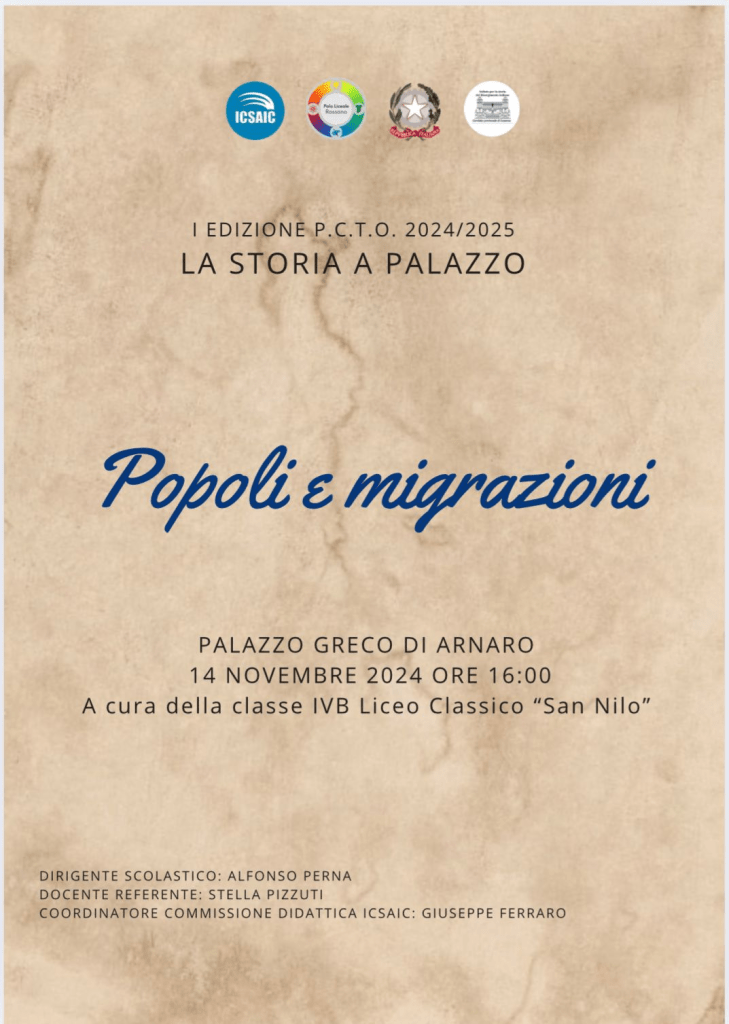 Si è svolto il 14 novembre scorso, il primo incontro di “La storia a palazzo” ideata dalla Commissione didattica dell’ICSAIC, dal nostro direttore Giuseppe Ferraro, insieme al Liceo Classico San Nilo di Rossano, diretto da Alfonso Perna. Per questo appuntamento di didattica della storia, curato dalla classe IV B del Liceo Classico “San Nilo”, guidata dalla professoressa Stella Pizzuti, si è parlato di Popoli e migrazioni al palazzo Greco di Arnaro.