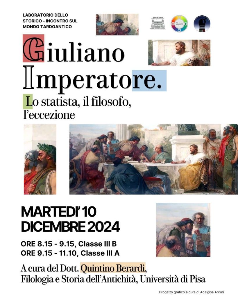 Ieri 10 Dicembre è stato inaugurato il secondo ciclo degli incontri del “LABORATORIO DELLO STORICO” con il seminario “Incontro sul Mondo Tardoantico – Giuliano Imperatore. Lo statista, il filosofo, l’eccezione” a cura del Dott. Quintino Berardi, Filologia e Storia dell’Antichità (Università di Pisa), coordinatore dell’Osservatorio Giovani Universitari.