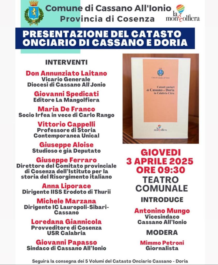 Abbiamo presenziato alla PRESENTAZIONE DEL CATASTO ONCIARIO DI CASSANO E DORIA lo scorso Giovedì 3 aprile 2025